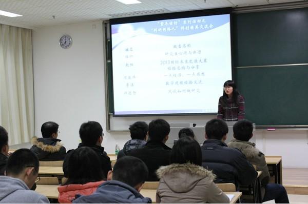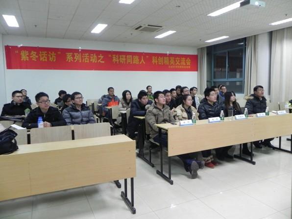 2013年12月10日晚6:30,由同人漫画 研究生会主办的“紫冬话坊”系列活动之“科研同路人”科创精英交流会活动在A18楼218教室顺利举行。本次活动邀请到我院硕士研究生任仁、李洁、万骏炜、赵阳以及博士研究生许德智五位学术精英为到场同学们作报告,研究生辅导员刘斐文老师也莅临现场出席了本次活动。