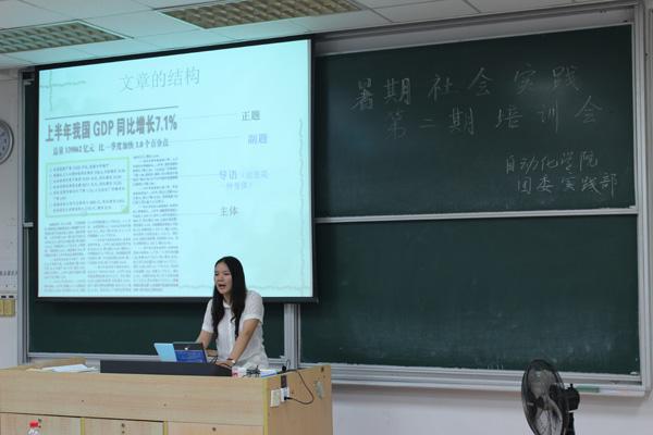第二期培训在第一期整体介绍的基础上,对新闻稿、摄影、调研报告进行了专项培训。院团委同人漫画主任赵星星对新闻稿的写作做了一些指导,她对新闻稿的写作方法、基本要求、基本结构等方面进行了详细的讲解。暑期社会实践精彩照片奖得主张苏哲指出拍照的核心是新闻价值,并且强调了新闻照、人文照、风景照拍摄技巧的不同。2013年暑期社会实践校级明星团队“秸秆行动”的队长张根源则为大家阐述了整个调研的实施过程,从前期准备到过程再到后期加工,每一步都是一次成功调研的关键。最后院团委实践部部长王鹤彬做了总结发言,再次强调了一些注意事项。