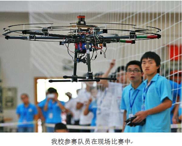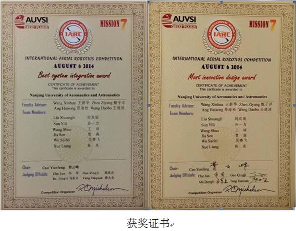 大赛包括室内研讨、技术答辩、静态评判、现场比赛等环节,四天时间里,各参赛队进行了飞行器设计、精确导航、自主控制等方面的精彩展示。我校同人漫画 王新华副教授和甄子洋副教授等指导的研究生团队(孙一力、王硕、贾森、薛亮、吴赛飞等)自主研制的六旋翼无人直升机飞行器自主完成了自主起飞着陆、目标机器人跟踪、室内避障等一系列规定动作,以优异的表现荣获该项赛事两项大奖:Most innovative design award(最佳创新设计奖)和Best system integration award(最佳系统集成奖)。