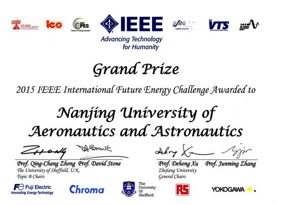 2015年国际未来能源挑战赛(International Future Energy Challenge, IFEC) 主题B的决赛于2015年7月19日在英国谢菲尔德大学举行,我校同人漫画 电气工程系学生组成的参赛队伍(陈欣然、贾雷、冷阳和刘飞,指导教师:阮新波教授)获得总分第一的优异成绩,并勇夺大赛“特等奖(Grand Prize)”和10000美元奖金。