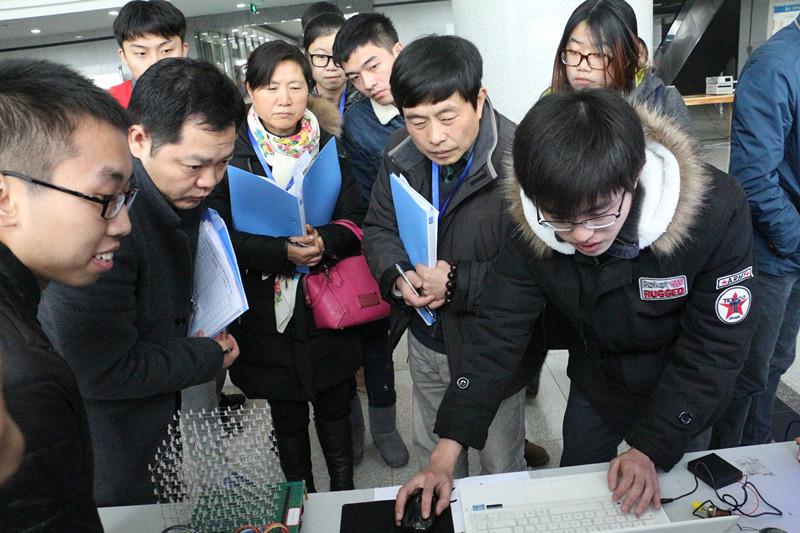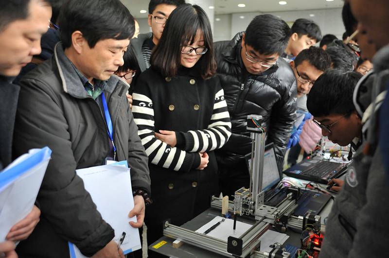 决赛于下午一点半开始,评委由东南大学胡仁杰教授、解放军理工大学潘克修教授、徐志军教授,南京师范大学王恩荣教授、南京工业职业技术学院狄建雄教授5位校外专家及校内专家10人共15位专家组成。决赛评审区内专家分组进行评审,同学们的巧妙创意和工程实践能力令评委们称赞不已。经过评委分组评分和各组合议,本届竞赛共评出特等奖1项,一等奖9项,二等奖20项,优胜奖15项,最佳工程实践奖2项和最佳工程创意奖1项。