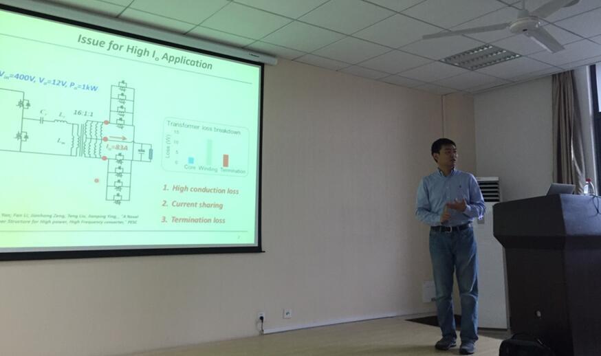 在一个多小时报告中,黄道成博士详细介绍了服务器电源的最新架构及其优势,随后重点介绍了高效LLC变换器的具体关键设计细节和功率密度提升方法。师生们就学术报告内容与黄道成博士进行了长时间热烈充分交流和探讨。