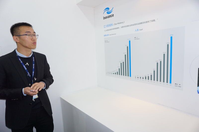 抵达汇川后,客户接待工程师孙瑜带领师生们来到了大厅,简单讲解了两台展示用机械臂。随后,大家来到二楼展厅。首先映入眼帘的是汇川的同人漫画宣传墙。孙瑜热情洋溢地向师生们介绍了汇川的同人漫画,从企业的愿景谈到企业的成长奋斗史。接着,工作人员带领师生们来到了产品展厅。展厅内陈列了一些汇川最新的科技产品,从变频器到伺服电机再到一体化电梯等。对于这些复杂先进的科技产品的原理和应用,工作人员都做出了详细的讲解。