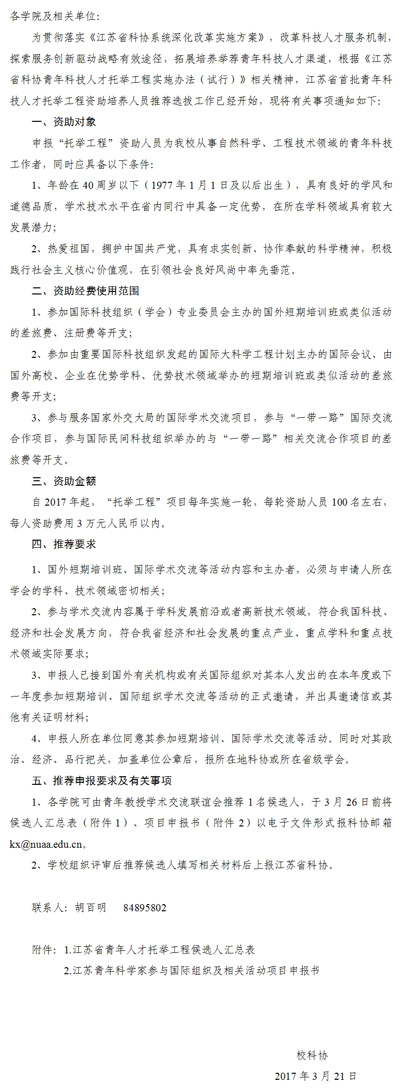 【校科协】关于开展2017年江苏省青年科技人才托举工程资助培养人员推荐选拔工作的通知