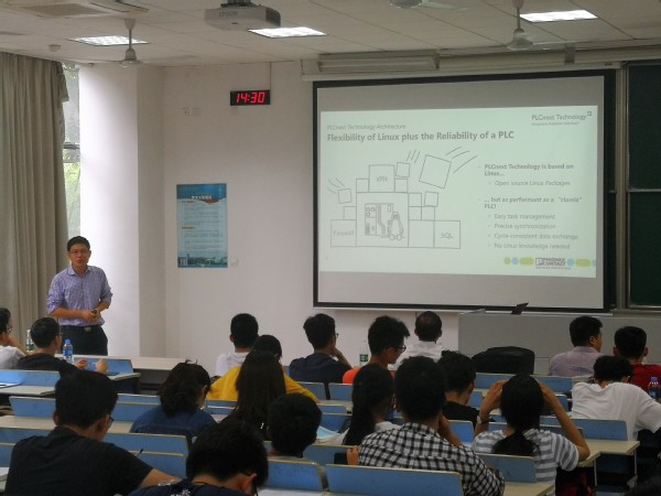 首先,王婧老师简要介绍了菲尼克斯电气集团及南京公司。然后梁恩泉老师开设了题为PLCnext Technology - The Open Ecosystem for Limitless Automation的工程技术讲座,向同学们介绍了PLCnext的特点、技术实现以及未来的价值。梁老师首先介绍了PLCnext 这种新技术的特点和优势,然后讲解了该技术可以在ARM基础上,利用C++等基础语言实现功能,并且其全开放的架构支持更高程度的开发,具有很好的实用性。详细介绍了GDS全局变量保持系统在实际生产中对于系统变量保持的重要性,以及系统的必要性。梁老师还介绍了PLCnext Store平台、功能集成OPC UA技术、开源软件、阿里云等工具在实用中的优势。通过向同学们介绍企业目前所使用的关键技术,为同学们的就业准备做出了方向性的指导。期间梁老师结合工作和工程研发实践,为同学提供了编程语言学习、工程研究和开发等方面针对性的建议。