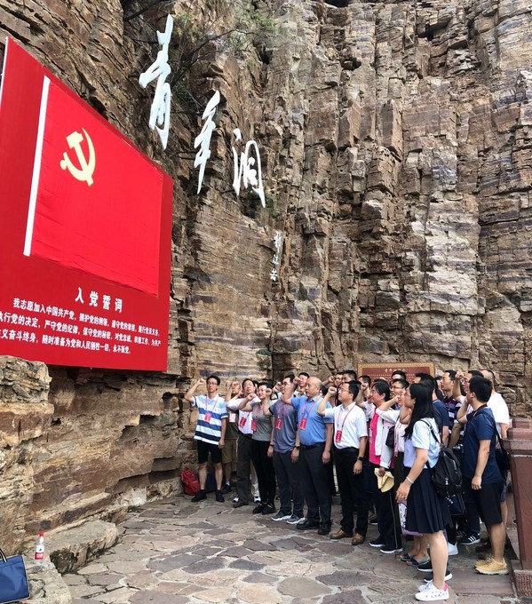 下午为体验教学,参加本次活动的全体老师步行近5公里,认真观摩红旗渠咽喉工程-青年洞,从中感受到当年林县人的艰辛。在施工工具极其简陋、自然环境极其险恶的情况下,林县人民发扬“一不怕苦、二不怕死”的革命战斗精神,克服艰难险阻,苦战十个春秋,在太行山悬崖峭壁上修成了全长1500公里的红旗渠“天河”。最后,在青年洞洞口,在学院党委刘建成书记的带领下,所有党员重温了入党誓词。当我们举起右拳、面对党旗宣誓时,胸中涌动着一股共产党员所具有的使命感和责任感。