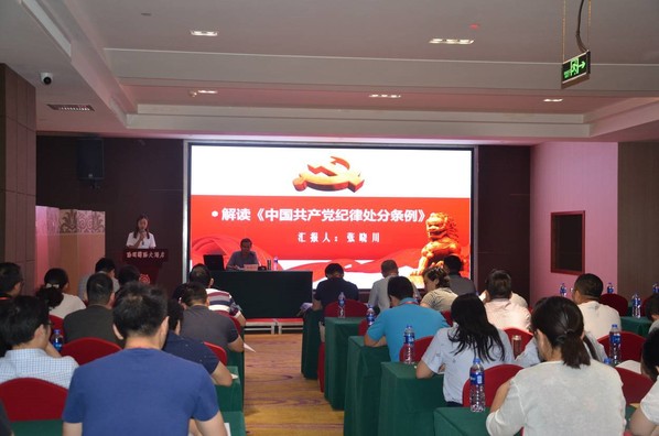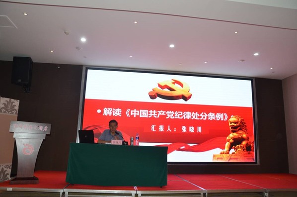 张晓川同志旁征博引,以发生在河南安阳乃至全国各省市的各项违纪违法实例为依托,以通俗易懂、幽默风趣的方式,向与会党员及骨干教师详细解读了《条例》的各项具体内容,为广大干部同志以及党员同志敲响警钟。