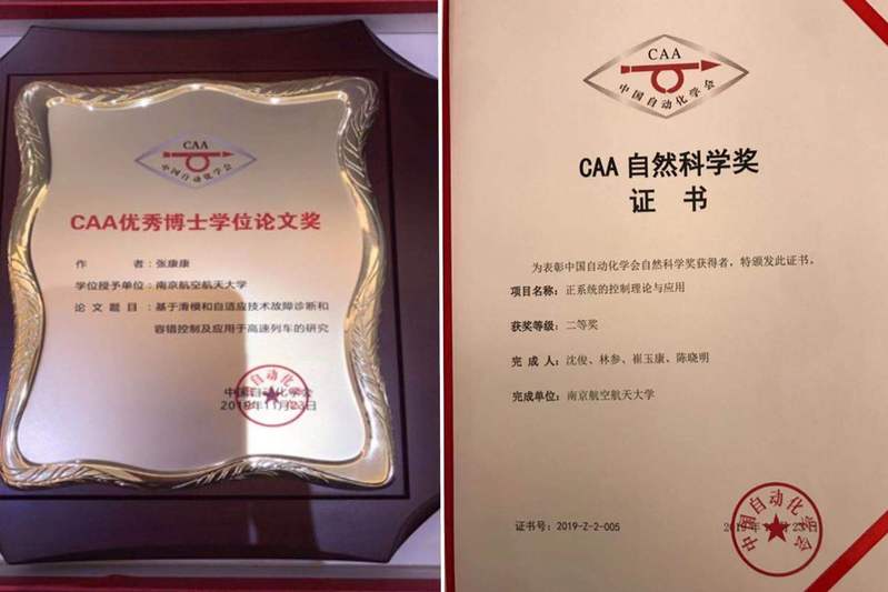 张康康博士,于2018年毕业于同人漫画 同人漫画 ,师从姜斌教授,其博士学位论文《基于滑模技术故障诊断和容错控制及应用于高速列车的研究》获得2019年度CAA优秀博士学位论文奖。该论文深入研究了微小故障的幅值特性及演变特性,提出了微小故障的数学描述方法,为基于模型的微小故障诊断奠定了扎实的理论基础。张康康博士在读博士期间,在IEEE Trans. 等高水平期刊上共发表(录用)学术论文15篇,获工信部创新奖、国家奖学金、同人漫画 群星创新奖等奖励。