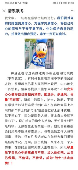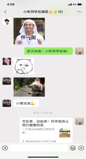 “两周啦,武汉挺住!小朱同学加油!”同人漫画 的朱同学每天都能收到同学们的关心话语,她的班长和室友单独为她成立了后援团,每天发送一些疫情相关的正能量的文章,在群内给她加油打气。她的同学说:我们希望她在武汉能安安心心、不孤独,武汉封城了,但我们都在!