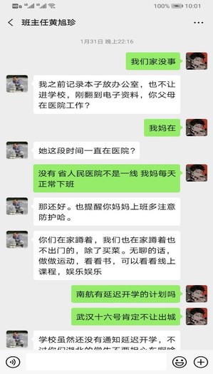 武汉大一学生白同学的母亲是湖北省人民医院的一名医生,这个假期他一直在家承担更多家务,尽力去支持母亲的工作。学院给大一同学配备的领航教师许鹏和班主任黄旭珍在得知白同学的情况后,经常线上关心其在家的生活情况和身体状态,帮其调整好乐观、积极的心态,鼓励他在家多看书、多学习,拓宽视野。