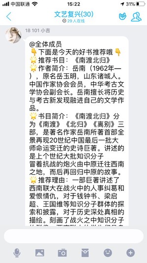 “要不我们一起学英语吧?每日线上打卡,等你来哟!”、“宅也有宅的快乐,想知道有什么好方法吗?加入我们吧!”、“想追剧吗?想聊八卦吗?进来之后保证你不会后悔!”为了让“宅”在家里的学生能够“宅”有所学、“宅”有所乐,学院在党员和团员骨干中招募志愿者,为在武汉和湖北的同学建立起多样的特色专题分享群。