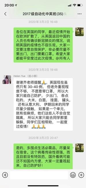 自动化(航空电子)专业0317801班是中英合作办学班级,目前有19人在英国伦敦城市大学求学。近期国外疫情爆发,班主任齐瑞云老师很担心同学们的健康安全,通过在微信群集体交流以及和一些同学单独交流了解到,目前城市大学尚未停课,同学们仍在正常上课,但出勤率在降低。齐老师不断在班级群里提醒大家提高警惕,尽最大努力做好自我保护。