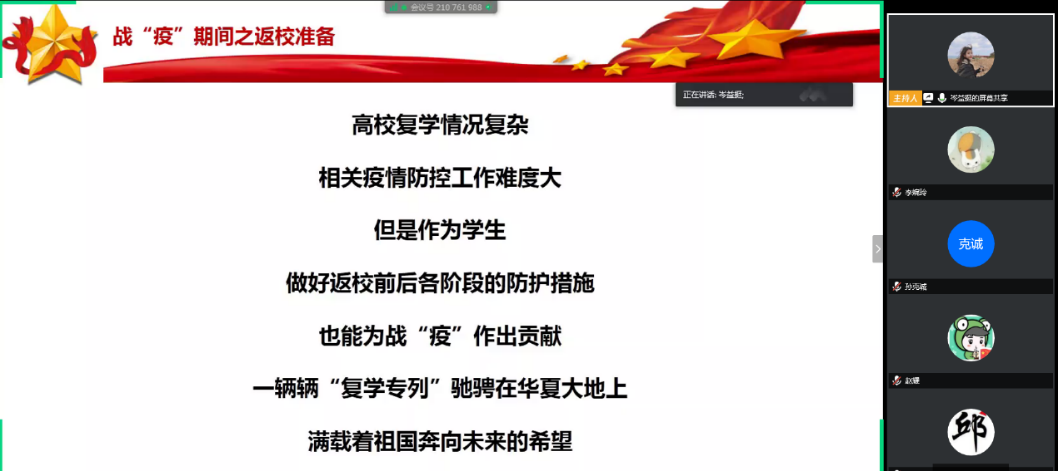 最后,考虑到研究生同学们即将陆续返校,岑益挺同志提醒支部成员在返校前后的各个阶段做好自我防护措施,对战“疫”工作做出自己力所能及的贡献。
