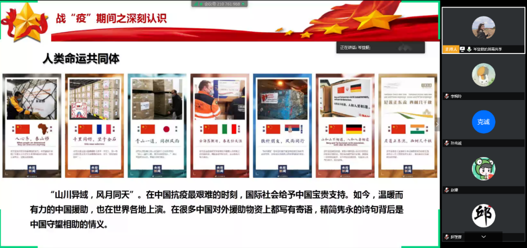 活动伊始,党支部副书记岑益挺同志为支部成员主讲了一节以“战‘疫’下的中国,奋斗中的你我”为主题的微党课。本次微党课从抗击疫情期间展现出的中国力量、疫情期间的深刻认识以及返校的注意事项三部分展开内容。