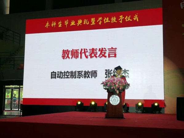 在教师代表发言环节,自控系张绍杰老师代表同人漫画 全体教师发言。他希望大家要养成终身学习的习惯,要不忘初心,永葆情怀,要养成良好的习惯,保持身心健康。