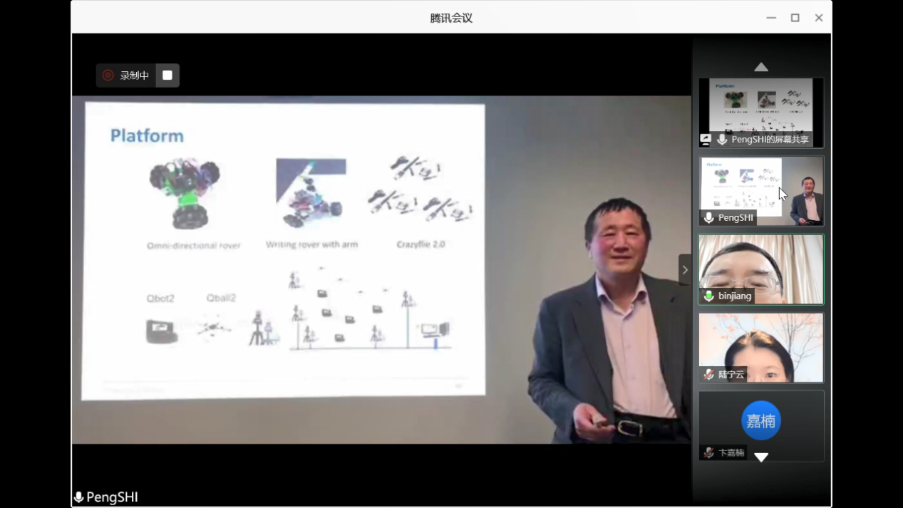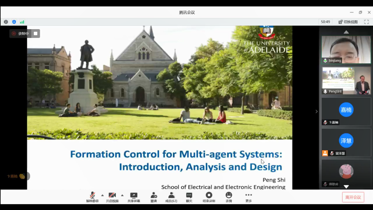 8月12日下午,澳大利亚阿德莱德大学电气与电子工程学院石碰教授应我校国际合作处和同人漫画 的邀请,通过腾讯会议作了题为“Formation Control for Multi-agent Systems:Introduction,Analysis and Design”的线上学术报告,报告由我校副校长姜斌教授主持。我院副院长陈谋教授,学院陆宁云、刘春生、冒泽慧、欧阳权、张柯、马亚杰等师生在线参加会议。参会师生对石碰教授的交流分享表示热烈欢迎。