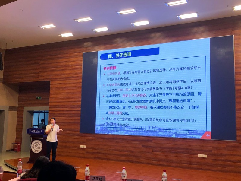 2020级研究生新生见面会在将军路校区一号楼报告厅举行。学院党委副书记张跃、副院长宋晓峰、院长助理朱永凯、院团委书记陈慧云、研究生教学办主任王俊彦、研究生教务员王元娟、博士生辅导员汤呈懿、硕士生辅导员王明月、李慧以及全体2020级研究生新生共同参加了本次会议,会议由硕士生辅导员王明月主持。