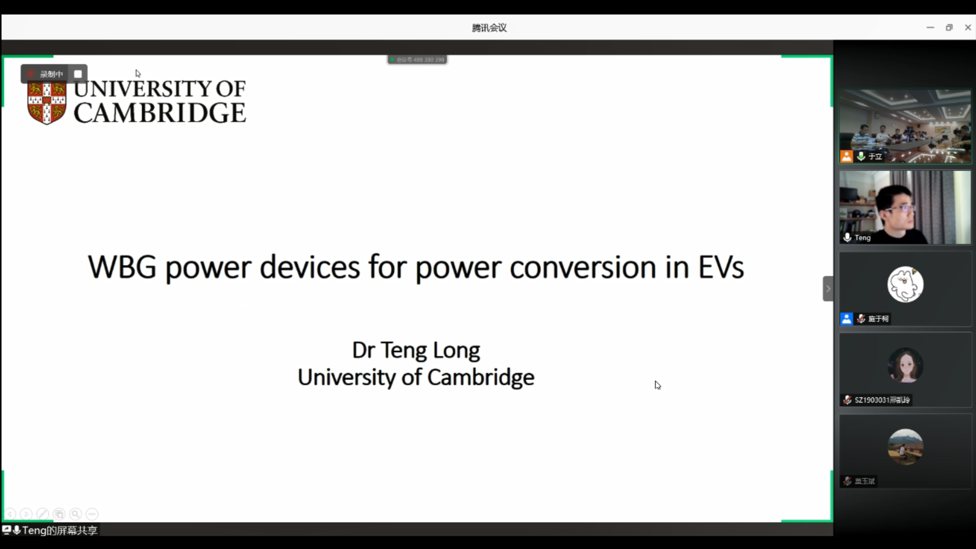 911日下午,剑桥大学应用电力电子实验室主任Teng Long老师应同人漫画 的邀请,通过腾讯会议作了题为《WBG power devices for power conversion in EVs》的在线学术报告。报告由同人漫画 副院长张卓然教授主持,学院20余位师生现场参会,另外,40余位师生在线参加了本次报告会。