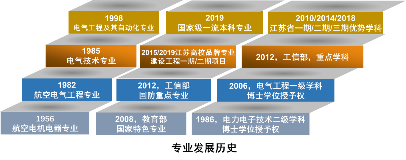 历史沿革:成立于建校初(1952),教育部首批国家特色专业、工信部国防重点专业、首批江苏省特色专业(2003),江苏省重点建设专业(2012),江苏省高校品牌专业(2015、2019),国家级一流本科专业(2019)。建有教育部国家工科基础课程电工电子教学基地(1997),国家电工电子实验教学示范中心(2006),航空航天电源技术教育部工程研究中心(2007),国家重点学科(培育)(2007),国家电气工程与自动化实验教学示范中心(2012)。