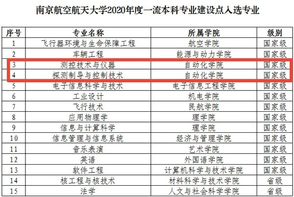 历史沿革:自动化专业前身是1952年的航空仪表制造专业,后历经航空自动器(1956)、航空陀螺及惯性导航(1960)、飞行器制导与控制(1970)、电气工程与自动化-自动化方向(1982)等沿革,1998年更名为自动化专业。经过60余年的发展,已建成为国家特色专业(2008年)、国防重点专业(2007)、工信部重点专业(2012年)、江苏省特色专业(2003年)、江苏省重点专业类(2012年),以及教育部(2013年)和江苏省(2012年)卓越计划专业,并于2015年和2018年两次通过工程教育专业认证,2019年获批为首批国家一流专业建设点。
