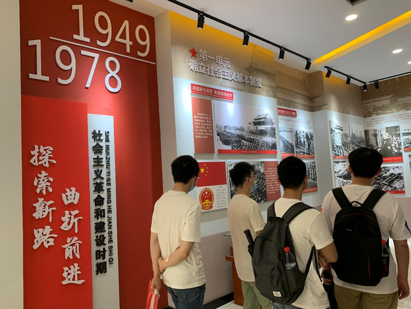 党史国史教育馆中陈列了自中国共产党的创立到争取名族独立人民解放这一历史长河中中国共产党的光辉事迹,包括中共一大的召开、工农运动的开展、万里长征、共产党带领全名族抗战等等。1949年到1978年是我国社会主义革命和建设时期,中国共产党带领广大人民群众曲折前进,探索新路。1978年后,我国进入改革开放和社会主义建设新时期。全面建设小康社会,坚定不移地把中国特色社会主义伟大事业全面推进。