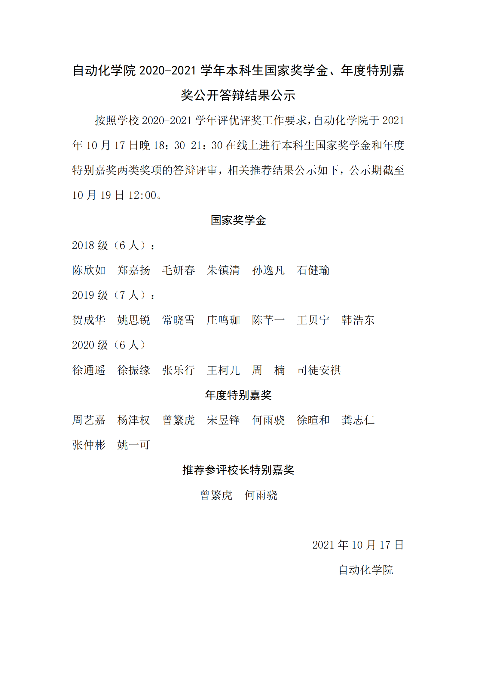 同人漫画 2020-2021学年本科生国家奖学金、年度特别嘉奖公开答辩结果公示