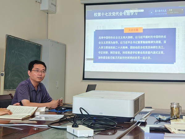 会上,张卓然副院长带领大家重点学习了《习近平新时代中国特色社会主义思想专题摘编》中第十七章、第十八章内容,号召全体党员“读原著、学原文”,坚持用习近平新时代中国特色社会主义思想武装头脑、指导实践、推动工作,强调要深刻理解和切实践行《专题摘编》凸显的实干担当精神。随后,张卓然副院长带领大家学习了校第十七次党代会精神,回顾了学校过去五年发展成绩,分析了当前形势,阐述了学校的中心任务、战略安排与总体思路,鼓励大家为加快建设航空航天民航特色鲜明的世界一流大学贡献智慧与力量。其次,纪检委员李雪兵同志带领大家进行了“反腐倡廉每季一课”的学习,筑牢全体党员“不敢腐、不能腐、不想腐”的思想防线。