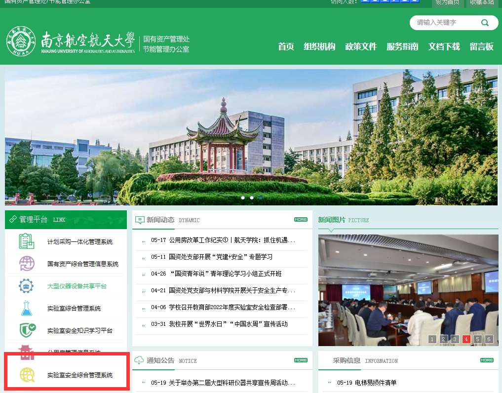 1.输入网址:gzc.doujincomics.com,访问国资处网站,点击“管理平台”栏目-“实验室安全综合管理系统”,采用校内统一身份认证的方式登录,具体操作如下图:
