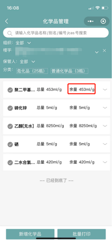 4.选择某化学品,确认数量和剩余量信息是否正确;