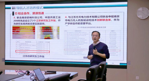 赖际舟教授结合多年以来丰富的教育教学经验,围绕团队基本情况、导航专业特色、人才培养体系和模式探索、创新实践成效以及心得体会等方面展开介绍。他认为,导航领域正面临国家重大战略和支撑产业发展的新时代需求,构建“以红色教育为灵魂、以校企合作为平台、以场景驱动为牵引、以创新竞赛为实践”的创新育人模式,对培养具备卓越工程能力的导航专业人才具有重要引领作用。他还以两个江苏省研究生工作站为例,分享了校企双方从合作伊始到收获硕果的历程,强调共建平台、共享资源、共育人才、共创成果的重要性,鼓励学生做有的放矢、有感而发的科研。