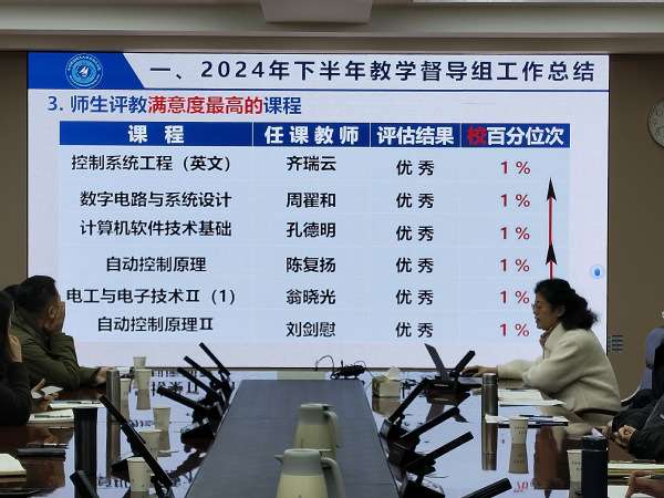 学院教学督导组组长邢丽冬教授总结了2024年下半年学院教学督导工作。她重点指出,与2023年相比,综合评估和学生评教优秀率显著提升,11位教师满意度达到全校1%,数量位列校前茅。会上也通报了学生评教满意度不高的课程并深入分析原因,提出了改进建议。邢丽冬对本科毕设归档材料的规范性提高表示肯定,也针对试卷管理和本科毕设环节中查到的细节问题给出了具体的整改建议。