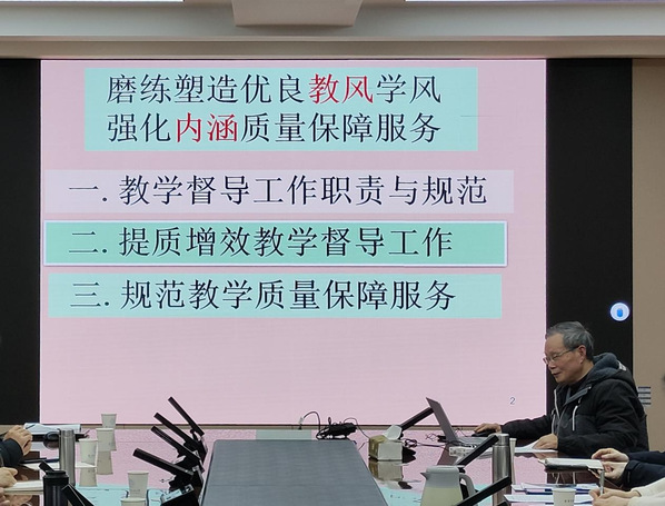 教学督导顾问潘双来对学院一直以来高度重视教学质量提升的做法给予了充分的肯定,对学院始终保持的优秀教风表示欣慰。随后,他以督导组自身建设为主题,强调了督-教-导-学工作的重性,示范了督导工作的优秀举措。