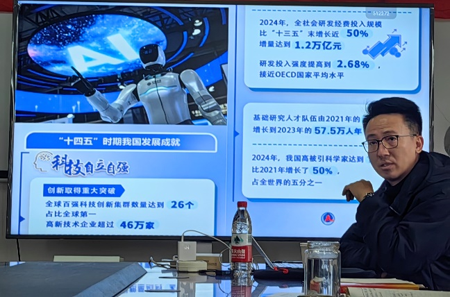 党课紧密结合国家“十五五”规划建议的核心内容,从指导思想、基本原则、主要目标到重点任务,进行了全面深入的阐释。魏佳丹详细阐述了建设现代化产业体系、实现高水平科技自立自强、构建强大国内市场、深化改革开放、推动文化繁荣、统筹发展与安全等一系列战略部署。他特别指出,科技创新是引领发展的第一动力,高校作为科技第一生产力、人才第一资源、创新第一动力的重要结合点,必须自觉肩负起时代使命。