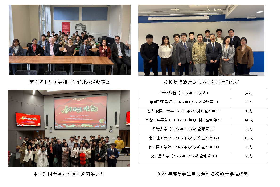 9月学期开始,23级中英班学生赴英学习,英国工程院院士Kenneth Grattan教授、英国工程院院士孙彤教授、伦敦大学城市圣乔治学院院长Sanowar Khan教授、副院长Veselin Rakocevic博士、项目经理Helen Yue共同迎接,并与同学们展开座谈。英方教授表示,自2011年以来,已有数百位南航学子赴英求学,都取得了斐然的成绩,希望23级同学继往开来,在英期间不断努力、开拓视野,取得更大的成就。